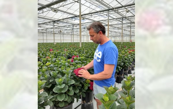 Michel Zeestraten stands among his Dark Ruby looking for the first signs of thrips, spider mites or lice. Together with specialists from Mertens and Koppert, he does research to organise his hydrangea cultivation organically. The plants are inspected every week and, if necessary, the biological control agents are deployed. Colleagues regularly come by to share their experiences in growing hydrangeas for cutting.