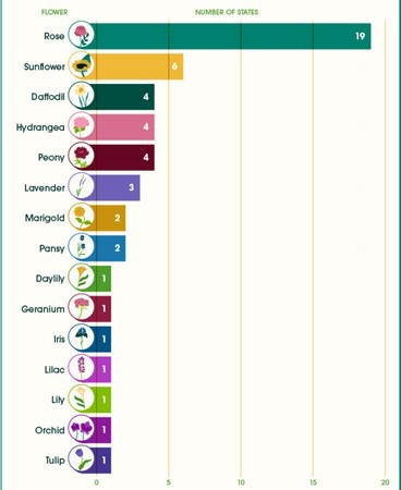 The broad-faced sunflower, tolerant of varying environments, stretched towards the sky in six states across the South, the Midwest, and the West. The daffodil, the hydrangea, and the peony brightened gardens in four states each, and lavender relaxed gardeners in three. The tulip, which saw a significant drop in international demand at the onset of the COVID-19 pandemic, ranked first in only one state—Alaska. Other flowers beloved by single states include the lilac in Wisconsin, the geranium in Wyoming, and the daylily in Oregon.