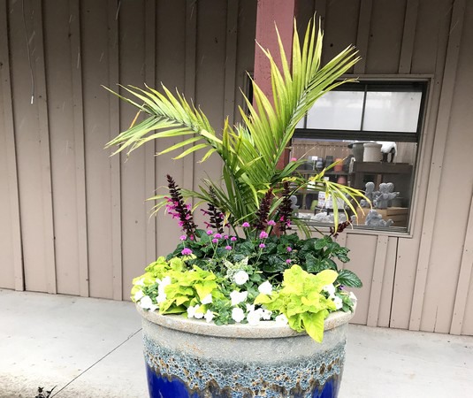 This combination outside of a West Michigan retailer’s store was sure to entice consumers. The tropical fern as a thriller plant is particularly interesting for a container in the Midwest. It also acted to add significant height as the plants were in an extra tall, gorgeous blue AquaPot, a self-watering, ceramic container.