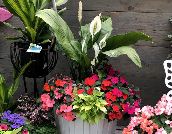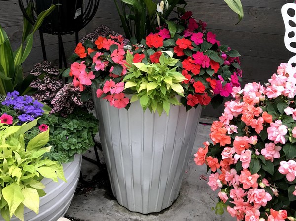 This combination container for shade brings both the flower power and color and texture. The white caladium in the middle is echoed by the variegated English ivy. The rainbow of colorful impatiens brings this container to a whole new level.