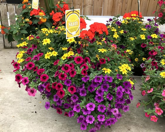 This awesome container for sunny locations features purple and magenta calibrachoa, bidens, and orange geraniums. It certainly does have flower power—why stick to a monochromatic color when you can have them all?