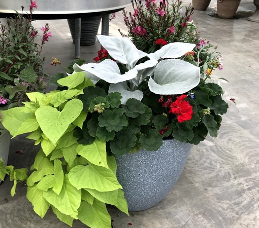 This combination features an Angel Wings Senecio (Senecio candicans), a spectacular silver-leafed foliage plant that is more refined than mullein, larger than lamb’s ear, or dusty miller. It will get to be 10-16 inches wide and tall and really echo the gray pottery. The lime sweet potato vine really sets off the silver foliage.