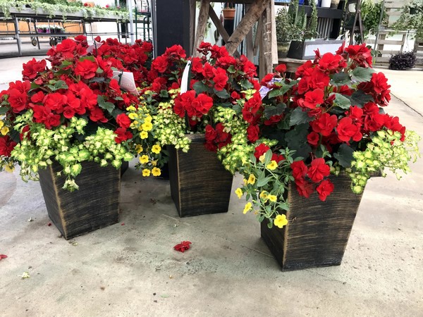 These petite patio planters featured Solenia Red Orange tuberous begonias, which were very showstopping in the retail. The Great Falls Yosemite coleus mixed with the yellow calibrachoa created such an awesome contrast between the red blossoms and the dark container.