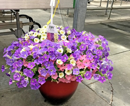This combination from Proven Winners is like sitting on the beach watching a glamorous sunset through the pinks and purples of clouds. This combination is Bermuda Blue Skies, which contains Supertunia Blue Skies, Bermuda Beach and Limoncello. This was actually grown as a hanging basket but the retailer helped consumers visualize how it would look in their own container.