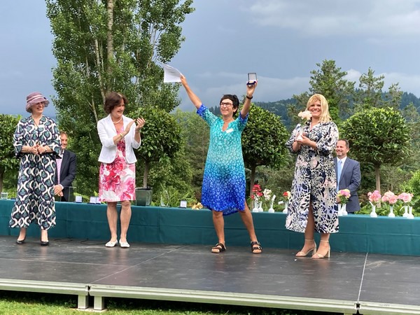 Rosa Eskelund behind Royal Estelle Plant 'n' Relax with the golden rose and award.