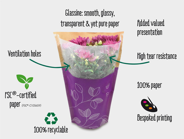 With bloom guard glassine, Weber Verpackungen brings (flowering) plants in transparent paper sleeves to life. This natural type of paper lets you see the packaged product. It has a striking glossy appearance too. "We want to create an experience and distinctive position. We do that through, , among other things, packaging with a story. This sleeve expresses that," concludes Olaf.