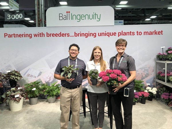 The Ball Ingenuity display includes the expanding collection of Jurassic Rex Begonias of four different sizes to serve customers indoors and out; the fragrant Jupiter series of Exacum powered by Ball FloraPlant breeding; and indoor flowering hydrangea from the Hydrangea Breeders Association and Aldershot. (left to right) Jesus Benitez, Lori Croghan, and Joan Mazat