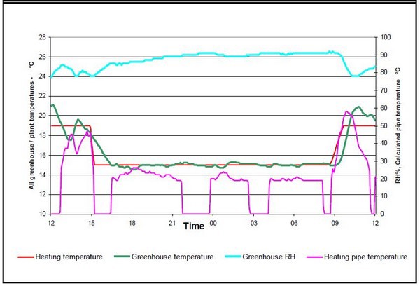 "If we look at the night period we can see that the greenhouse with humidity control had an average RH of 85% compared to 90% in the ‘no control’ greenhouse. However, to achieve this, the pipe temperature in the humidity control house was 10oC hotter."