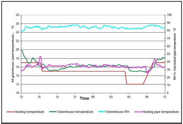 "If we look at the night period we can see that the greenhouse with humidity control had an average RH of 85% compared to 90% in the ‘no control’ greenhouse. However, to achieve this, the pipe temperature in the humidity control house was 10oC hotter."