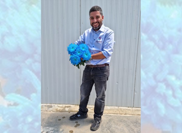 Juan with a bunch of dyed Salvador. Well-dyed disbudded chrysanthemums are highly sought after.