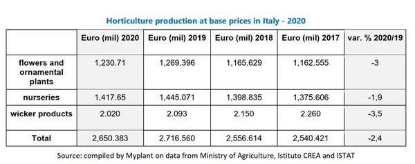 According to the Ministry of Agriculture, the value of Italian production in 2020 has been 2.65 billion euro (which is 4.8% of production at base prices of Italian agriculture). This is 2.4% lower than in 2019 and when looking at the flowers and ornamental plants, they have shrunk by 3%, and nurseries by 1.9%.