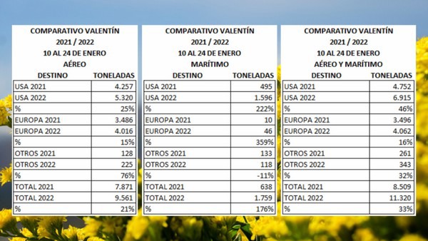 In the graphic Expoflores compares flower exports between 10 and 24th of January by airplane and by boat with last year. Basically all figures have gone up, especially the tonnage sent by boat increased (tripled!) enormously.
