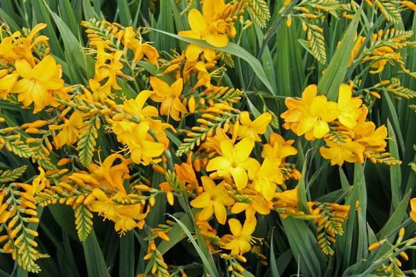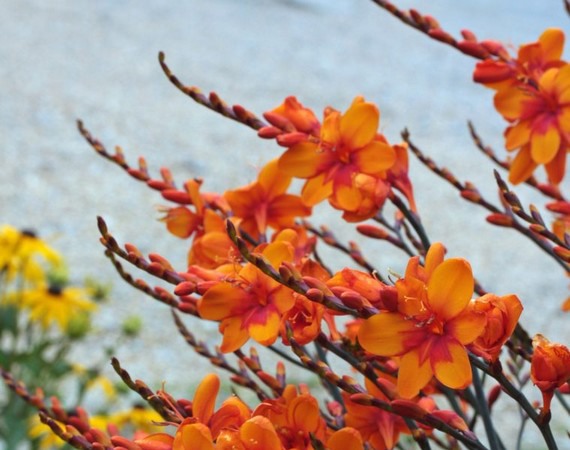Crocosmia Walberton’s Yellow was bred by Walberton Nursery founder and world-renowned plant breeder David Tristram in the 1960s. He selected it for its exotic-looking outward-facing yellow blooms that last late into the season, and its clump-forming, erect habit, finally releasing it to the UK market in 2002. Crocosmia Walberton’s Bright Eyes was selected by David in 1998 for its similar habit and flowering season, but vivid yellow-orange flowers with a deep red eye. And finally, David selected Crocosmia Walberton’s Miss Scarlet in the early 2000s for the same exceptional habit and scarlet red flowers.