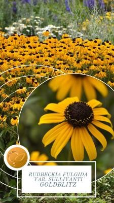 Goldblitz will not only look at its best in containers or borders later in the season but is also highly suitable for landscaping. The golden yellow flowers with dark centre attract bees and butterflies, and also look wonderful in a vase to brighten up the house. Goldblitz allows the production of a flowering Rudbeckia fulgida in one season and remains an excellent performer that will bring joy to many gardens.