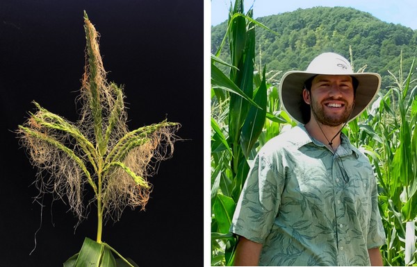 Left: Mutant maize tassels in which programmed cell death has been suppressed. Right: Harry Klein in the maize field. Credit: UMass Amherst