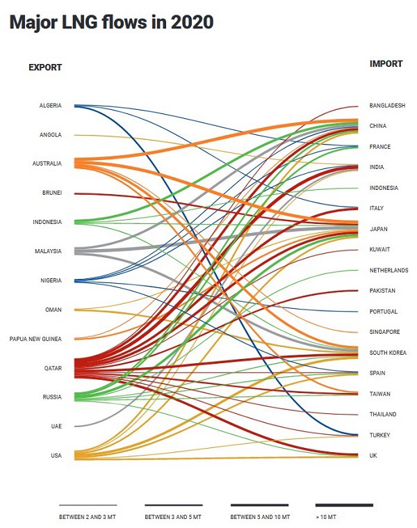 LNG import graph. The International LNG Importers Association's (GIIGNL) 2021 annual report shows 2020's LNG export and import flows.