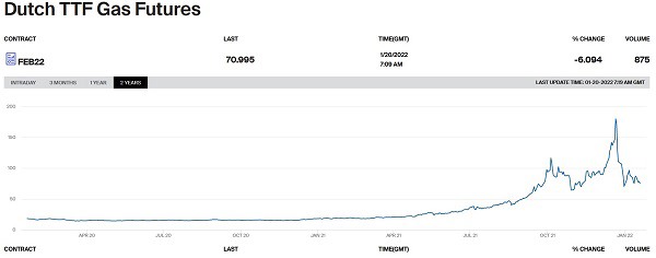 The past two years' gas prices on Title Transfer Facility (TTF), a virtual gas marketplace. Those prices, which had been stable for a long time, began climbing in April 2021. "TTF is the only Dutch (virtual) trading place where our network's gas can be traded. So much of this is traded on the TTF that the platform's gas prices are normative for Europe. The rest of the world also closely follows the TTF's activities," writes the Dutch energy network operator, Gasunie, about the platform on its website.