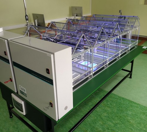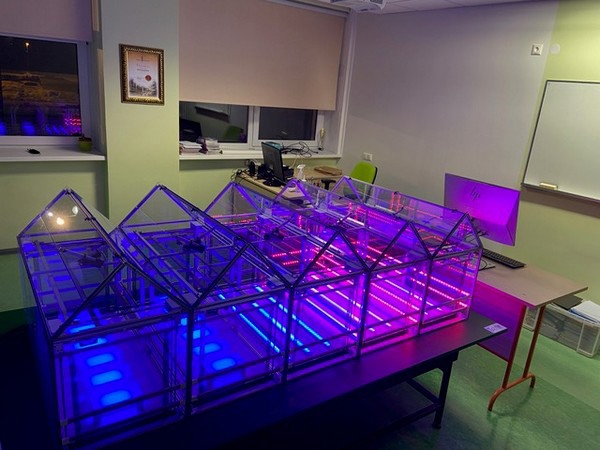 The simulator allows students to create strategies for five different greenhouses at once. With this system, students can simulate and visualize heating, irrigation, humidification, ventilation, lighting and air circulation. The greenhouse has moving roof ventilation on both sides, also top and side curtains. Heating, irrigation and top lights are illuminated using different LED-s. In addition there are 2 air circulation fans per greenhouse.