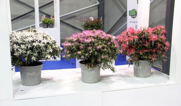 Second place went to Dutch tree grower R. van Opstal for his Leucothoe axillaris 'Opstal55' characterized by its curly leaves. The bronze medal was for the Flemish creation of Bloemisterij Leybaert from Moerbeke. The azalea grower marketed the Azalea Star Style, an azalea with star-shaped flowers. The compact azalea blooms for up to 4 weeks in spring and thrives best in sun or semi-shade. The hardy Azalea is available in 3 colors (pink, lilac, and white). It was the lilac-colored variety that won awards at Florall.