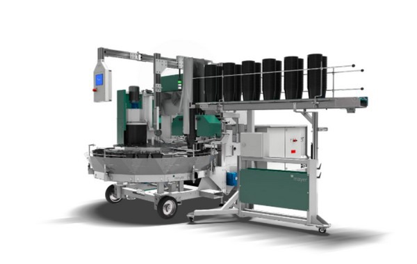 The new TM 2432D of Mayer has a range of applications. In double mode, it fills pot sizes 9- 16 cm diameter (square pots up to 14 cm edge length) with a peak output of up to 5,500 pots per hour. The 14- cycle turntable with 28 pot supports is frequency-controlled as usual and can be adjusted centrally by means of a ratchet.