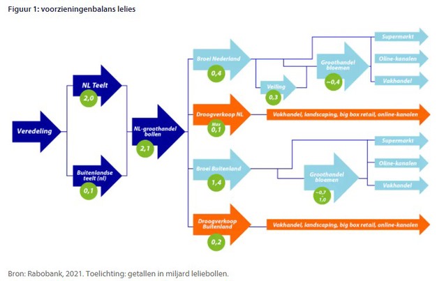 The area with deliverable bulbs in 2021 has increased about 10% from 3,787 hectares in 2020 to 4,175 hectares in 2021 (source: BKD). Because cultivation results of the lilies in 2021 were below average, the consequences of this area increase were not yet visible. Finally, the Dutch lily sector leads the world with 85% of the global supply. Figure 1 shows the supply balance for the lily sector. An increase in the cultivated area in the Netherlands therefore directly affects the supply on the world market. This makes Dutch companies in the lily sector each other's biggest competitor.