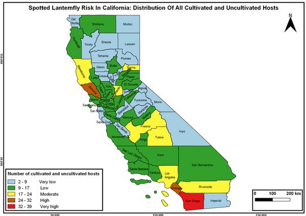 It is predicted that many agriculturally important regions in California are at a high risk if this pest ever invades the state. California climate and a wide host range including both cultivated and wild species can support the establishment and spread of the spotted lanternfly. The tree-of-heaven, which is a favorite host of the spotted lanternfly, is an invasive tree that is spread throughout California and can serve as a source of infestation.