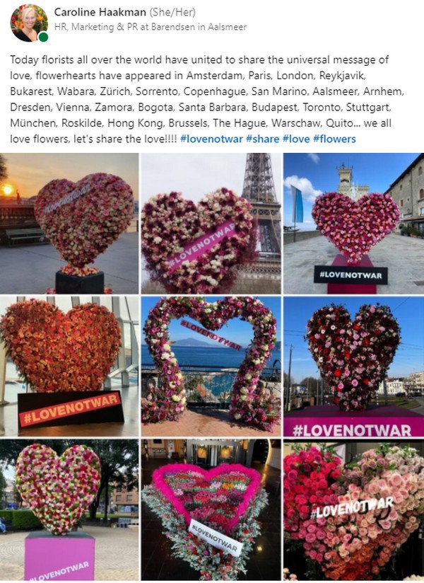 On March 12th, in 22 cities all around the world, a heart decorated with flowers has been placed with the message #lovenotwar. This heart-shaped flower decoration is meant to sympathize and show compassion to all those people in Ukraine and abroad affected by the war.