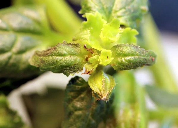 Broad mites feed on new growth, so that’s where you want to look. The mite’s toxic saliva results in copper or purplish-colored damage on growing points. Leaves often turn downwards. Unfortunately, “new growth” also means buds, which can become discolored and malformed. Flowers often are prevented from fully developing. Petioles and internodes can also become shortened, so look for stunted plant growth, as well.