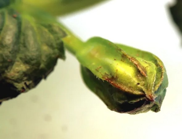 Broad mite damage on unopened buds. Photo by S. Jandricic, OMAFRA