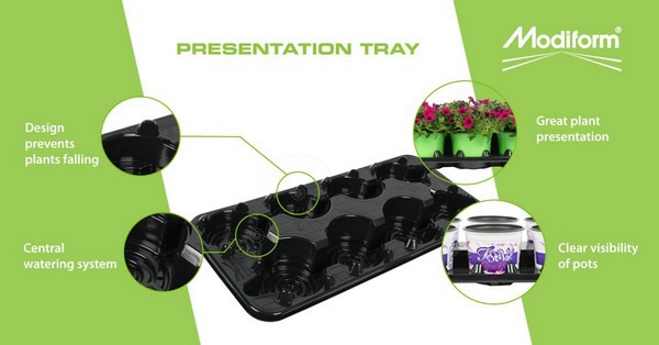 Nowadays, pots are part of the appearance of the plant. More and more attention is paid to the pot printing, but unfortunately, it often does not come into its own because the pots are presented in transport trays, hiding the print. So why not a lowered front? "A good idea, but a challenge to implement," says Lisa van Koningsveld of Modiform. A few years ago, they added the so-called presentation tray to their transport tray range, and recently they introduced a new presentation tray.