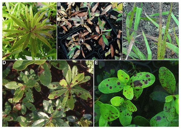 In ornamental nurseries, infections start at early stages of seedling and cutting propagation in the greenhouse (Fig. 3A), leading to severe economic losses. Swelling and cracking of necrotic areas at crown or basal stem level may develop into basal stem canker. Leaf spot symptoms caused by Calonectria spp. vary according to host species, host age, and pathogen species. Generally, they consist of small, water-soaked spots that are brown, red, or purple in color, which eventually turn light to dark brown with age and are surrounded by a red, brown, or purple border and chlorotic halo.Symptoms of leaf spot often start at the leaf tip and, under conductive conditions, the entire leaves become browned or blackened. Moreover, characteristic black, elongated streaks or cankers can begin to appear along the axis of the shoot following infection within a single season.