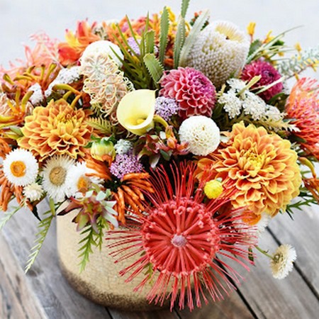 With that in mind, these 'dog days of summer' aren't easy to shake off. Whether you're planning a cozy outdoor rendezvous, catching up on the latest floral trends, or simply spending more time relaxing at home, A Passion for Flowers created a summer-inspired arrangement. A few of their favorite proteas are included, like Banksia, Grevillea, Leucadendron, and Leucospermum, with the foliage choices as a nod to the 'summer essentials' trend, as well as some dahlias, lion's tail, zinnias, and kangaroo paw for an extra splash of color.