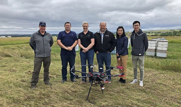 UAS operations conducted by the University of North Dakota and Bee Innovative over two sunflower fields near Bismarck, North Dakota, in August 2019. (Left-right) UND UAS pilot James Moe, David Lyall, Kate Lyall, Paul Snyder, Haochi Zheng, and student Jiyang Zhany. Photo courtesy of UND Aerospace.