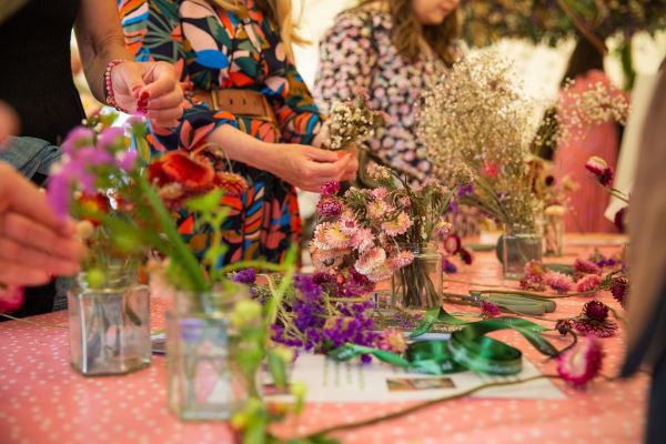 Members of the public make buttonholes and corsages from seasonal British flowers.