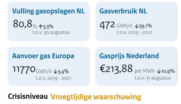 Gas supplies are getting better and better. (The Hague update of 9 September on this can be viewed here). In France, the UK, and Spain, the effect is already visible in daily prices. Specialists point out that prices are quoted at around 100 ct/m3, while in north-western and eastern Europe, the price is around 200 ct/m3.