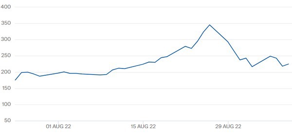 The gas price for 'winter 2022' up to and including 8 September on the Title Transfer Facility. For the remaining months of 2022, the gas price was between €210-215/MWh by 11 am Friday morning. View the current figures here.