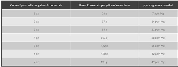 Extra magnesium can be supplied with a cal-mag fertilizer or by using Epsom salts. Epsom salts can be mixed with most fertilizers that do not contain calcium or can be applied at higher rates once per week. See Table 1 for application rates of Epsom salts when applied at an injection ratio of 1:100.