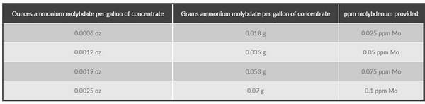 Molybdenum should be applied at a constant rate of 0.1 ppm. If more is needed, ammonium molybdate can be provided at rates posted in Table 2.