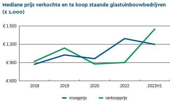 In mid-2022, there were 35 companies for sale. According to NVM in its report 'Vastgoedmarkt in beeld Agrarisch & Landelijk' (Real estate market in view Agrarian & Rural), this means that the decline that started in 2015 has continued. The asking price of glasshouse horticultural businesses fell slightly compared to 2021 and is around 1.2 million euros.