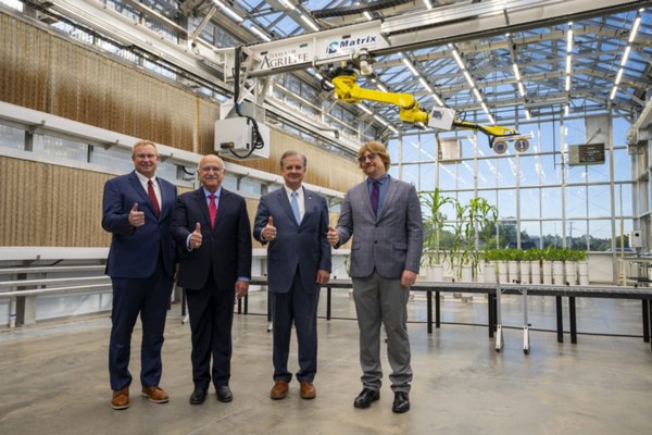 The greenhouse facility also includes three additional 600-square-foot research greenhouses without robotic systems. All five greenhouses feature advanced LED lighting systems and eaves that are 19 feet high. Lab and field researchers can also access a 1,500-square-foot headhouse equipped with autoclaves and potting tables, as well as a laser room and common-use laboratory.