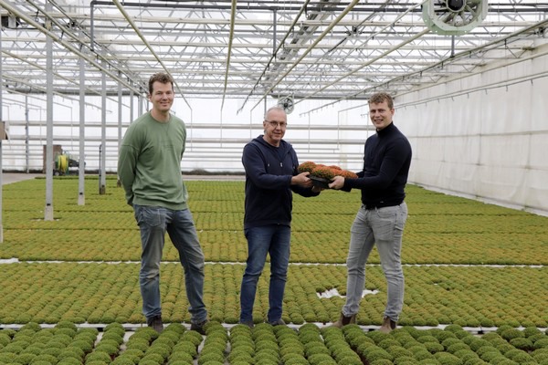 Henk Kooij symbolically hands over his plants to Harm (left) and Reinier (right) Hoogendoorn