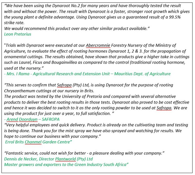 Among others, the product showed greater results compared to the top European product during independent trials by Agro Research International B.V. in the Netherlands. Also, it was tested by the University of Pretoria and compared with several alternative products to deliver the best rooting results in each of those tests. Also, the growers that are using the product are pleased. See references below: