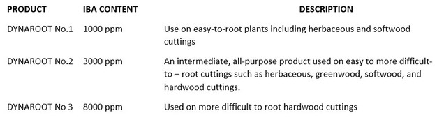 “Dynaroot rooting hormone powders contain indole-butyric-acid (IBA), a synthetic version of naturally occurring plant hormones known as auxins, usually produced naturally in the growing tips of plants. Hormones are needed by plants in very small quantities, so Dynaroot powders contain low concentrations of synthetic auxins in a ready-to-use powder.”