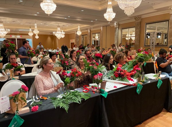 About 80 people participated among florists, importers, and organizers of weddings and events in North America. Roses, carnations, pompoms, hydrangeas, and alstroemerias, among other species, were on display, and the attendees had the opportunity to learn the new world trends in bouquets and build their own Christmas arrangements.