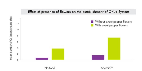 Figure 3: Semi-field trials showing the effect of the presence of sweet pepper flowers on the establishment of Orius laevigatus adults.