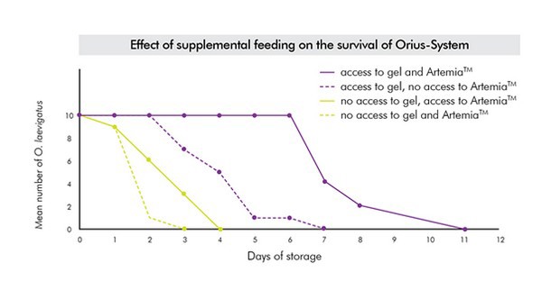 Figure 1: Lab trials showing the effect of supplemental feeding and access to gel in the packaging on the survival of Orius laevigatus adults during storage.
