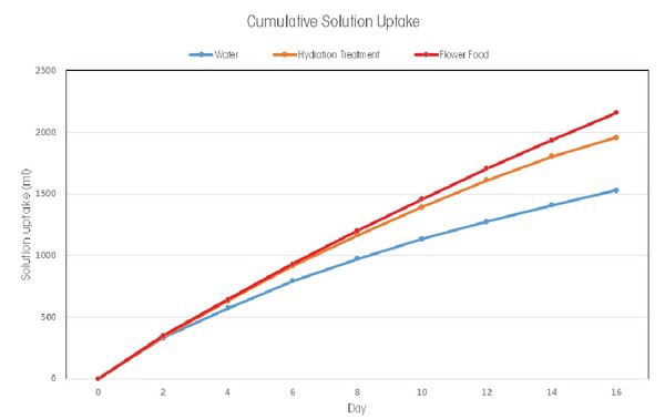 The graph below shows the solution uptake over time with water, a commercial hydration product, and flower food.