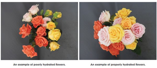 - Hydration and rehydration of flowers (at the farm before transportation, after dry storage, and into a vase) using commercially formulated hydration products and flower food that facilitate optimum water uptake.