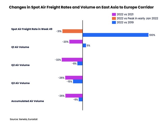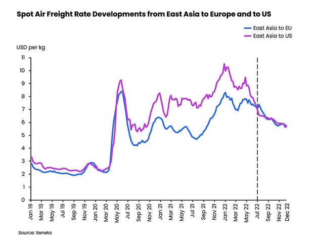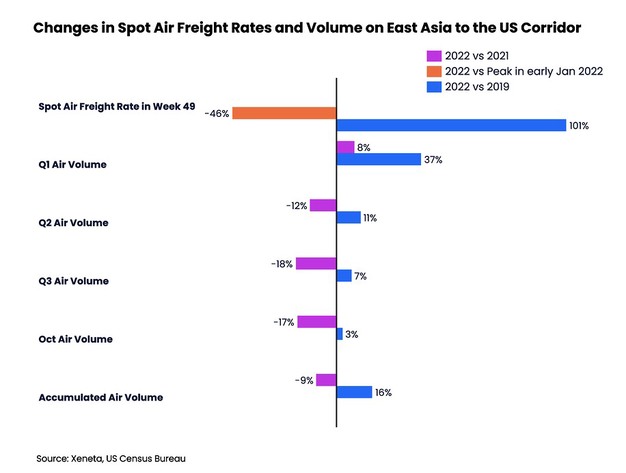 Put into a historical perspective, the spot air freight rate from East Asia to the US in early December hit a two-year low. But remained 101% above the same period in 2019.
