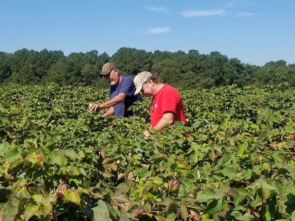 Mark Rouark (left) and John Rouark, cotton farmers from Bostwick, Georgia, examine cotton plants in a test plot at the J. Phil Campbell Research and Education Center Field Day. Producers depend on UGA Extension agents for research-based advice to improve production practices. Now UGA faculty are working together to help farm communities under stress.